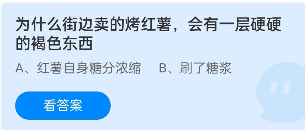 支付宝蚂蚁庄园小课堂12月10日的其中一个问题是:为什么街边卖的烤红薯会有一层硬硬的褐色东西?有许多人还不知道答案,下面就快来看一下蚂蚁庄园12月10日的正确答案吧。