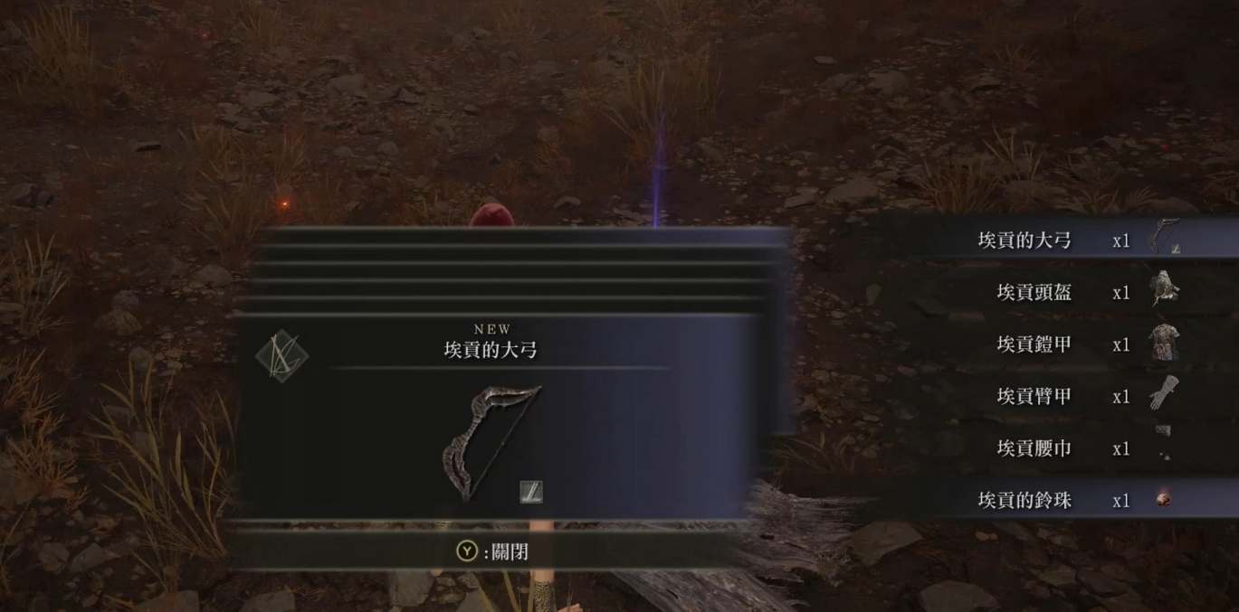 7、打完之后下山去拿奖励,去上一次埃贡躺着的位置找他,可以拾取他的装备以及玲珠(可用于兑换弓箭)