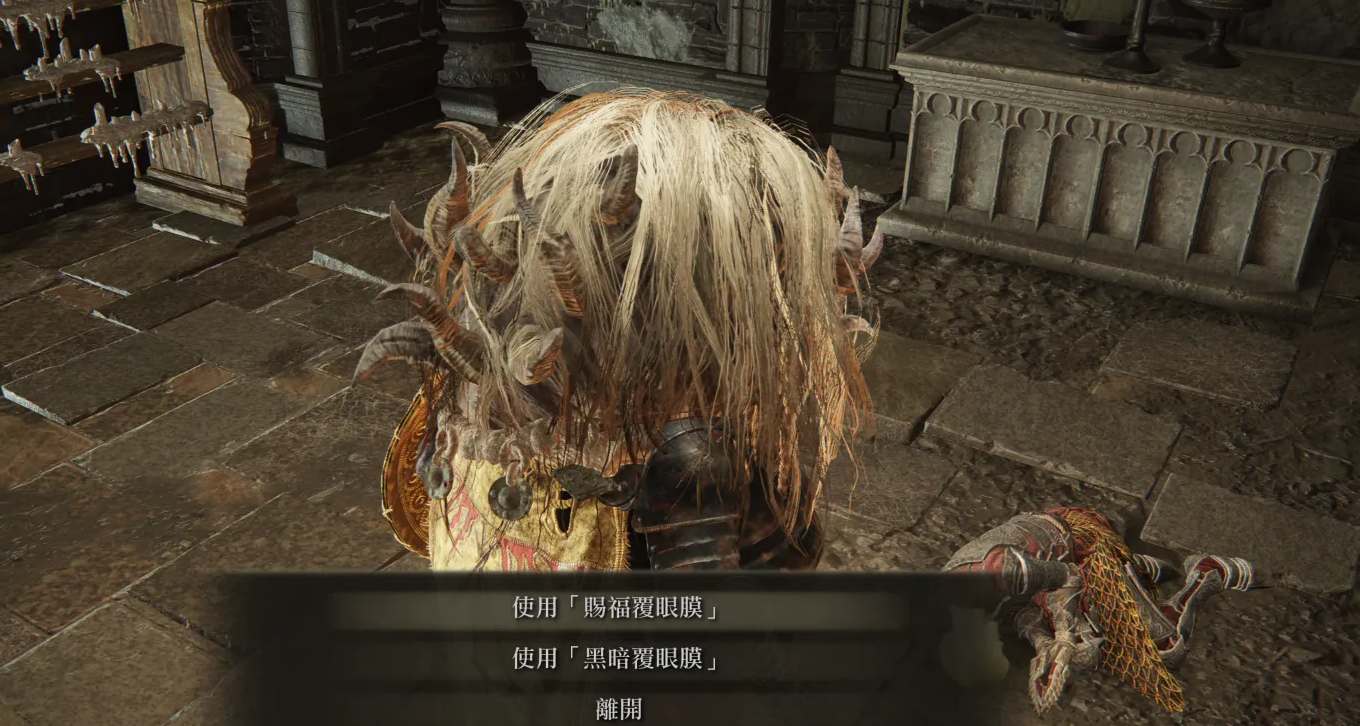 5、进入祈祷亭后调查倒地的昆兰,提交「赐福覆眼膜」或者「黑暗覆眼膜」可以兑换奖励。只能提交一个,另一个可以等二周目来拿。