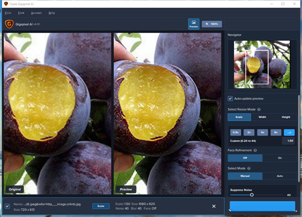 4、这是一张720X613的水果照片,我放大1.5倍至1080X920,我们可以看到修复的效果还是不错的,原照片比较模糊,修复后边缘清晰了很多,而且色彩明亮了很多,应用常见还是很多的,关键是一键操作,比较简单。