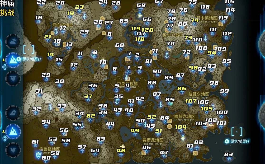 塞尔达传说王国之泪中一共有152个神庙,其中有120个地面神庙、32个天空神庙。分布位置可以参考以下攻略。