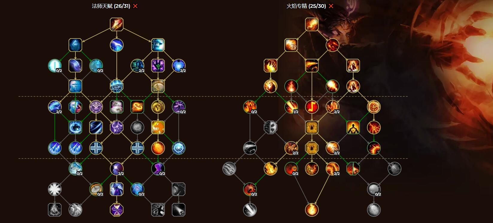 由于前夕等级只有60级,因此通用天赋树只有26点、专精天赋树只有25点天赋可用。加点如下图: