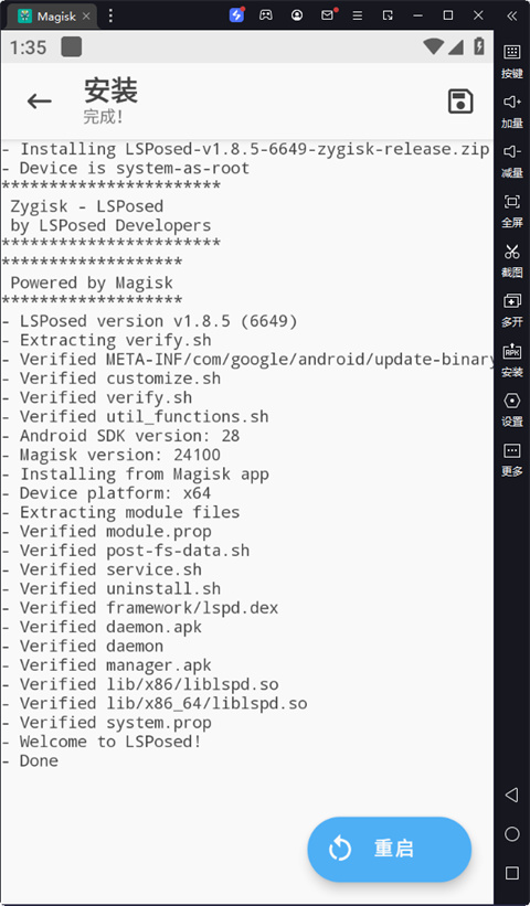 4、安装LSPosed管理器(LSPosed manager1.8.5.apk),显示已激活表示安装完成。