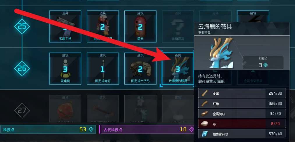 在科技界面26级最后一个,需要先获得云海鹿然后才能解锁制作。