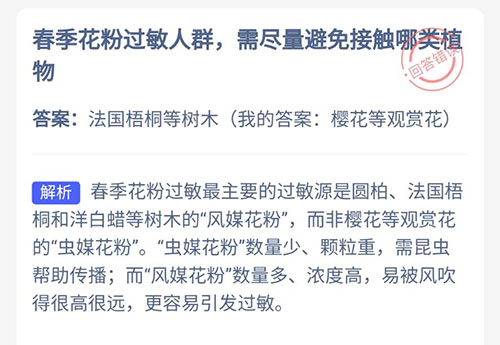 春季的开始,迎来的是百花盛开,有不少人选择出去游玩。但是在春季花粉过敏的人群,出行的过程中需要注意尽量避免接触哪类植物?今天的支付宝小鸡答题就问到大家这个问题,不知道答案的小伙伴赶紧来看看吧。