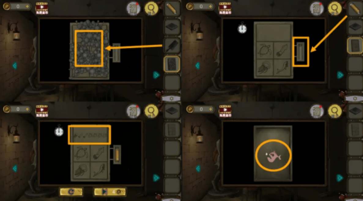 48、将"鱼形金属块"放入墙上凹槽,完成小游戏。