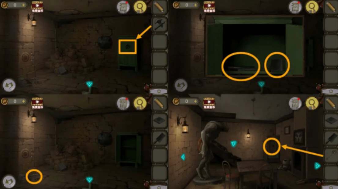 39、根据地下室的箱子提示,打开右边的柜子,获得"金属片"。