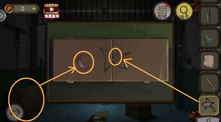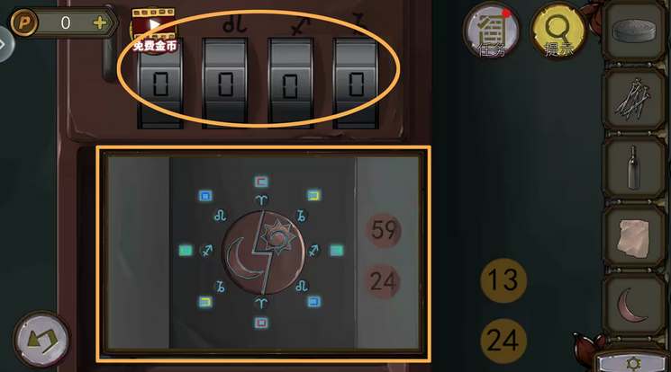 77、罗盘装上金属块,解开罗盘机关,拿到钥匙。机关解法:点击四个图案组合起来的星座符号,需要选对5次。拿到钥匙后,用钥匙打开。