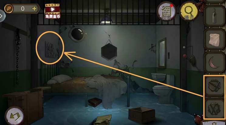 75、用半个船舵打开监狱房床下的箱子,拿到罗盘和地图。