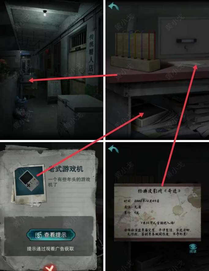 2、开门后触发剧情,糖人店需要有图案对应汉字的密码才能开启,左侧桌面上拿到竖式算盘和皮影戏的票,书洞里拿到老式游戏机。