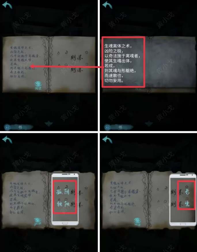3、公共浴室锁住了,左拐到厕所、理发一侧,在横幅处拿到书,了解到生魂离体之术的线索。对照手机获得线索“孤阴则不长 独阳则不生”