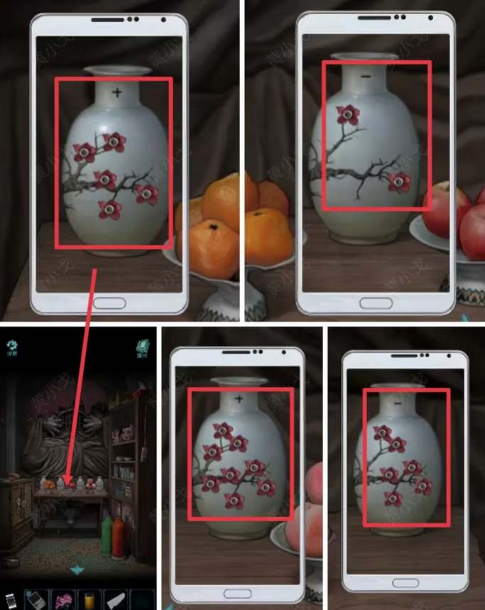 8、进入糖店里间,左边藤编柜子有文字机关,中间桌子有供果和空花瓶,根据花瓶上的提示来放置花的数量,可获得半张明信片,并触发剧情。