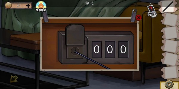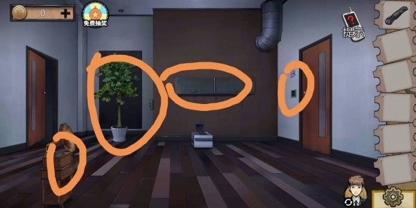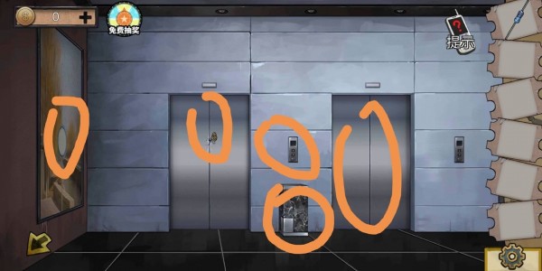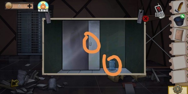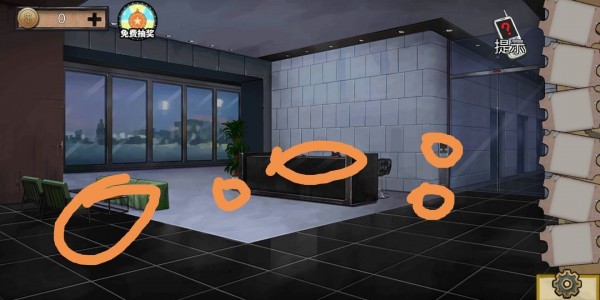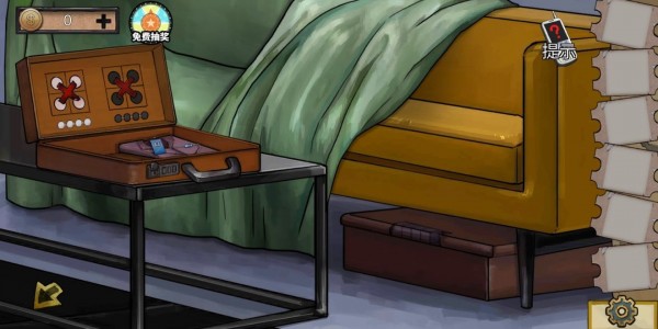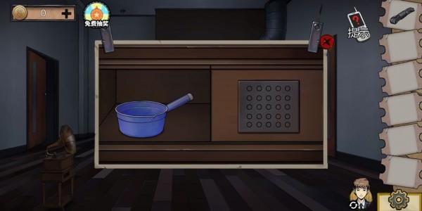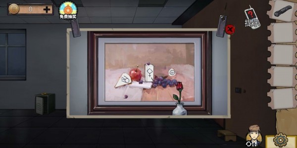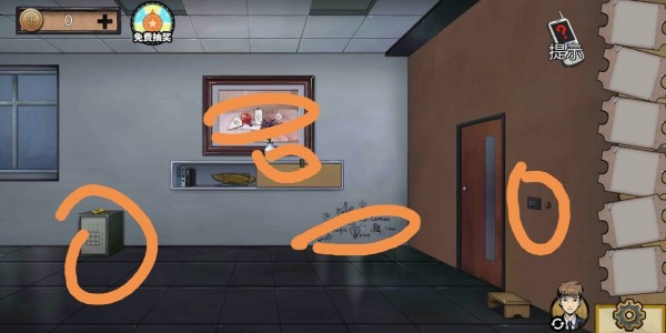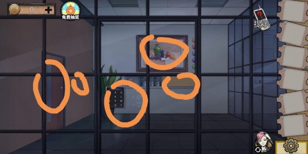 21、点击保险箱,根据刚刚看到的密码盘图案线索,移动三次按钮,打开保险箱拿钥匙,然后点柜子,左上角的花瓶,打开拿卡片,卡片放到涂鸦上。