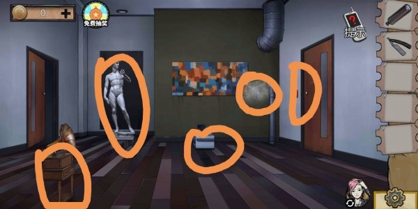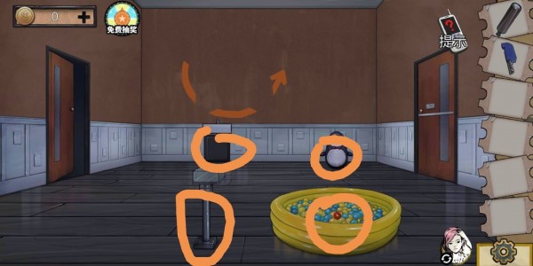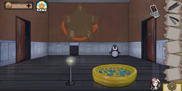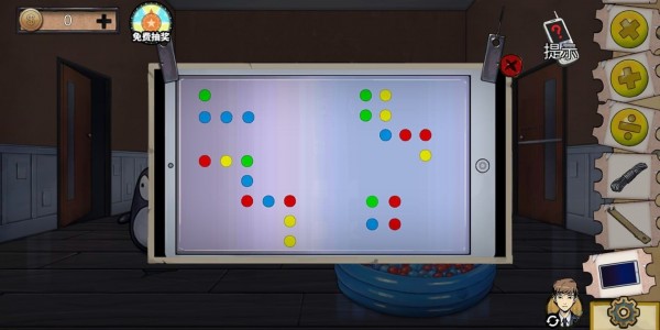 23、点击壁画下面的柜子,移动木板拿到手柄,然后点击上面的壁画,根据壁画上亮起的颜色点击旁边对应颜色的按钮,然后拿到圆孔钥匙,去到左边的房间。在泡泡池里拿到红色的球,在企鹅嘴巴里拿到纸条,在洗手池边上拿到剃刀。