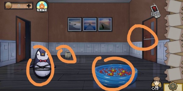 27、在泡泡池子里拿到4个黄色球,然后在墙边背包里拿到钥匙和平板,再拿到企鹅身上的绳子。然后回到第一个房间,用钥匙打开花瓶下面的柜子拿到铁盒子。