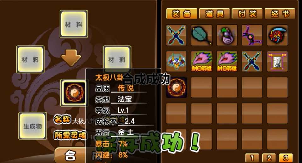 由于合成有一定随机因素,需要大家多次刷新,运气好的话可以得到2.9成长率的金木或金火属性太极八卦。
