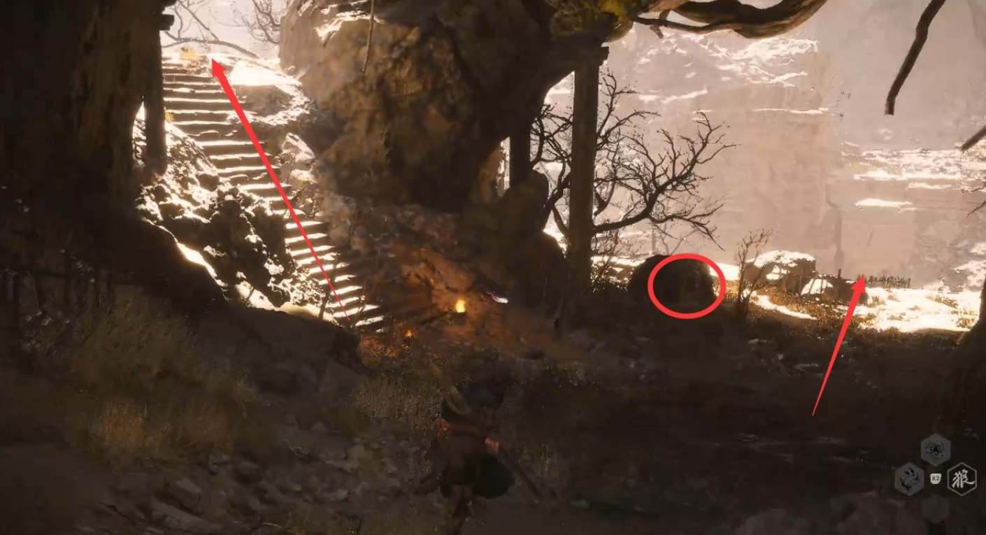 先去探索左边的山上,房子里有宝箱。拿完回来清理弓箭手,走到尽头的院子里击败地狼后得到【精魄】地狼。