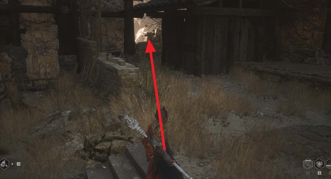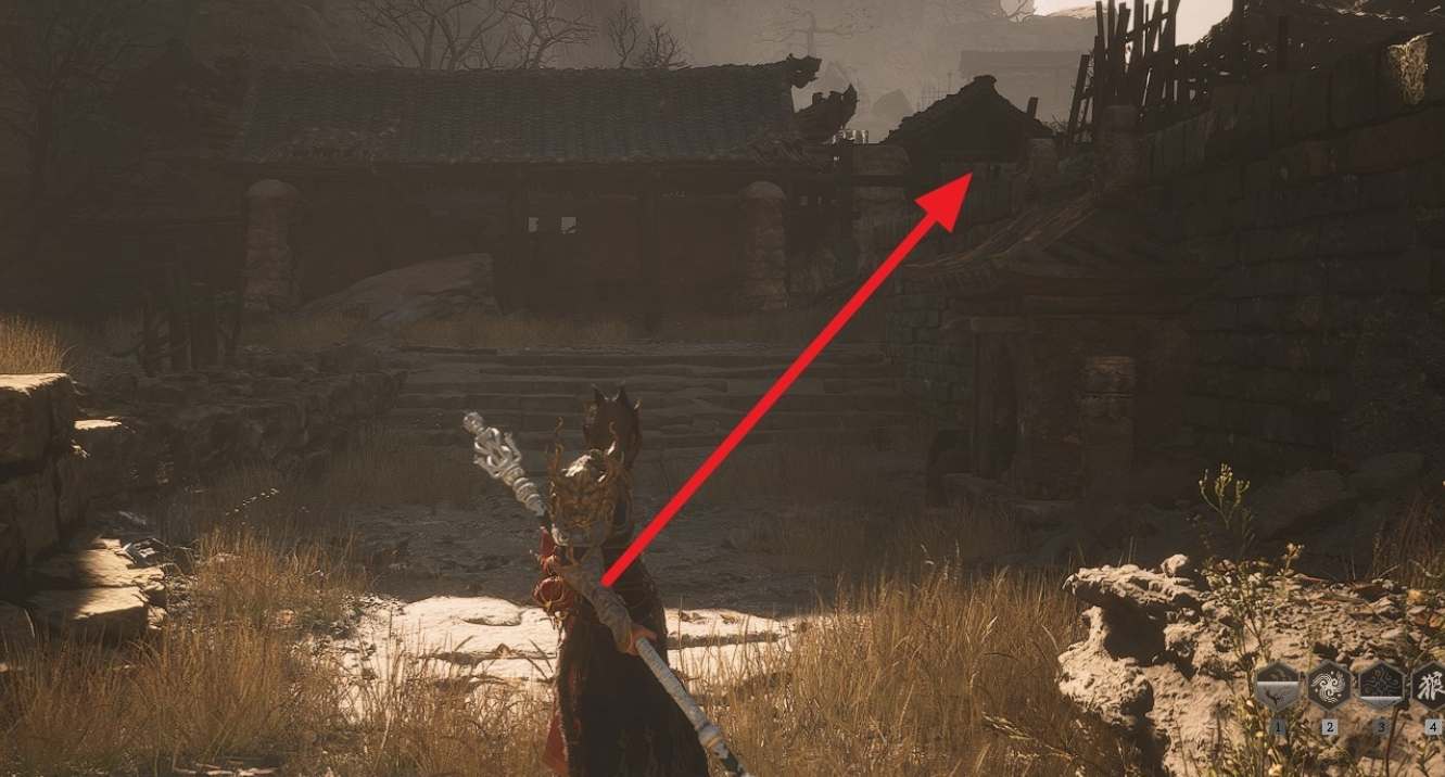 这里找到三层围墙和一个楼梯,上楼梯后直走往右看找到一个发光的罐子,击碎罐子即可获得醒酒石。