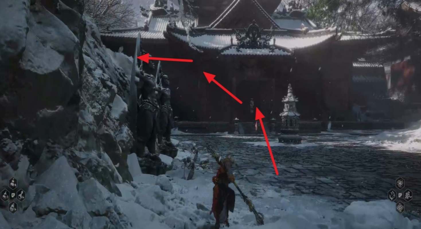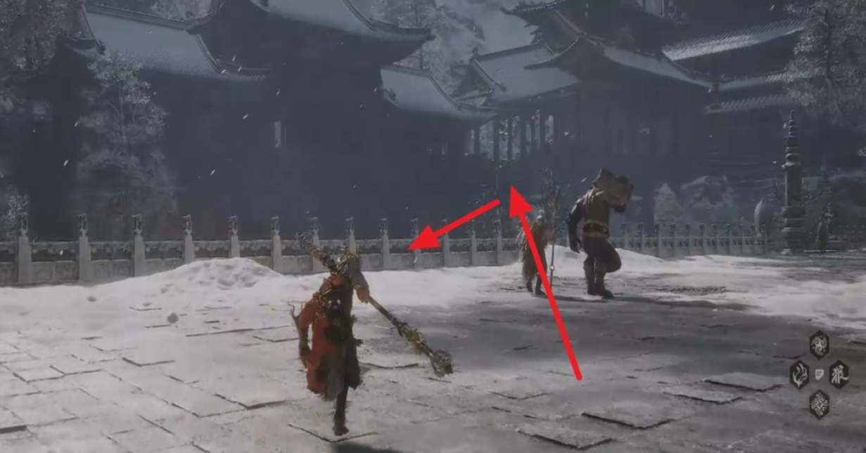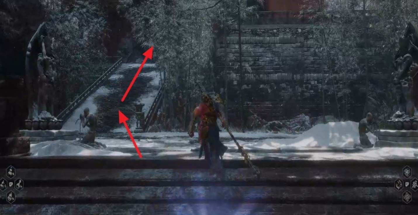 2、从小雷音寺寺门往前走,穿过中间房间后来到楼梯,跳到左侧区域。