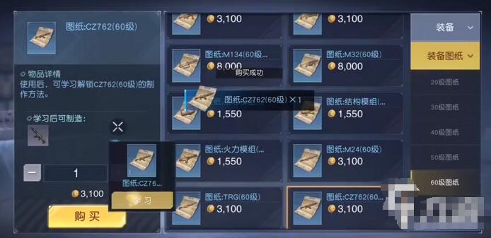 1、首先需要玩家花费金币购买武器的图纸,60级是3100,不同等级的图纸花费的金币越多,需要的材料也越好,本身的等级低就买低级的图纸。
