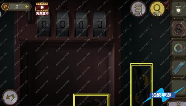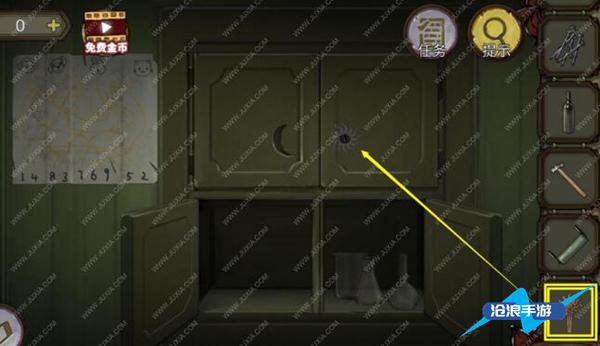 4、根据左边墙上的提示,得到密码3749。获得手套。