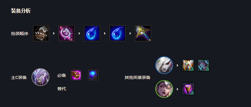 开局首抢的装备是手套,先做丽桑卓的法爆蓝霸符,最后无尽。前期不升人口,只留吸血鬼和丽桑卓,不卡利息的话也可以留妖姬,莫甘娜。5人口卡着利息D出三星丽桑卓,就可以锁血上人口。