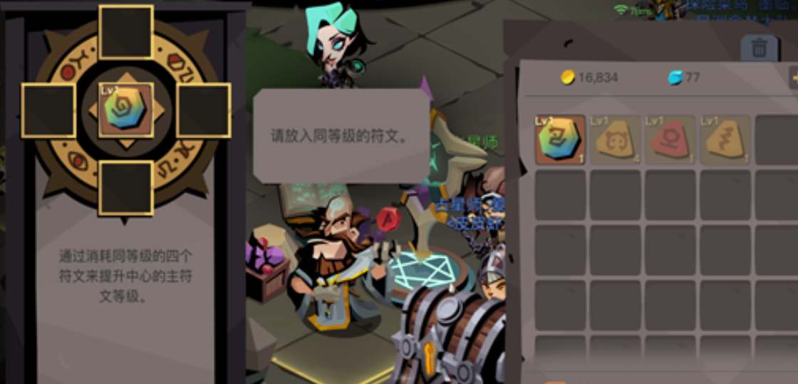 3、符文还可以进行升级,如下图所示,将需要升级的主符文放在中间,然后在周围放入4个同等级的符文作为狗粮,即可进行升级。
