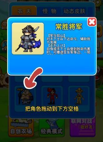 1、前往主页守卫者皮肤页面,长按常胜将军,接着把角色拖拽到空格处。