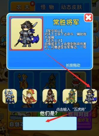 3、之后将张飞、黄忠、马超角色拖动到空格处,在下方区域输入五虎将,即可解锁马超。