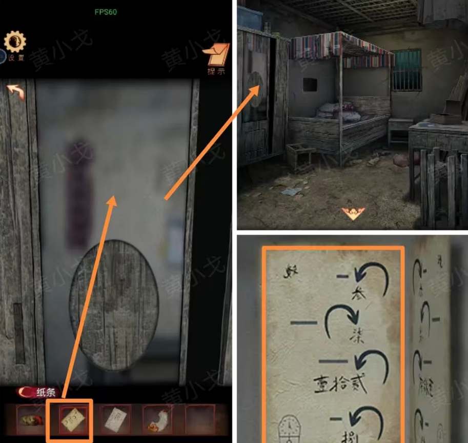 10、点击衣柜门上的镜子,放上纸条,获得线索时钟指针转动时间与方向:逆时针-时针-3、顺时针-分针-7、逆时针-分针-12、逆时针-时针-8。