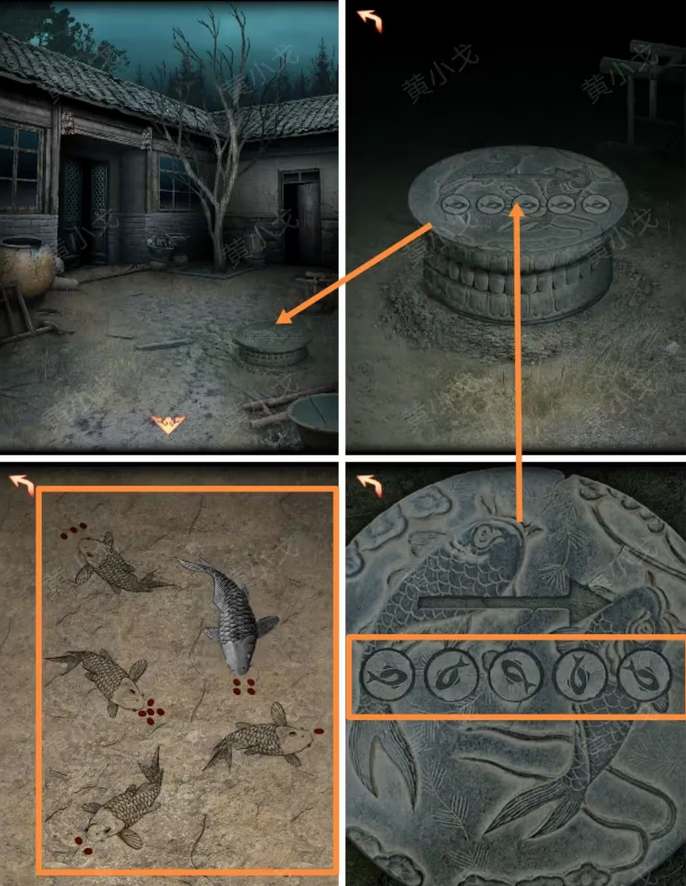 22、院子点击中间的石盘,调整鱼石块的朝向:右、左下、左上、下、右下,获得钥匙。