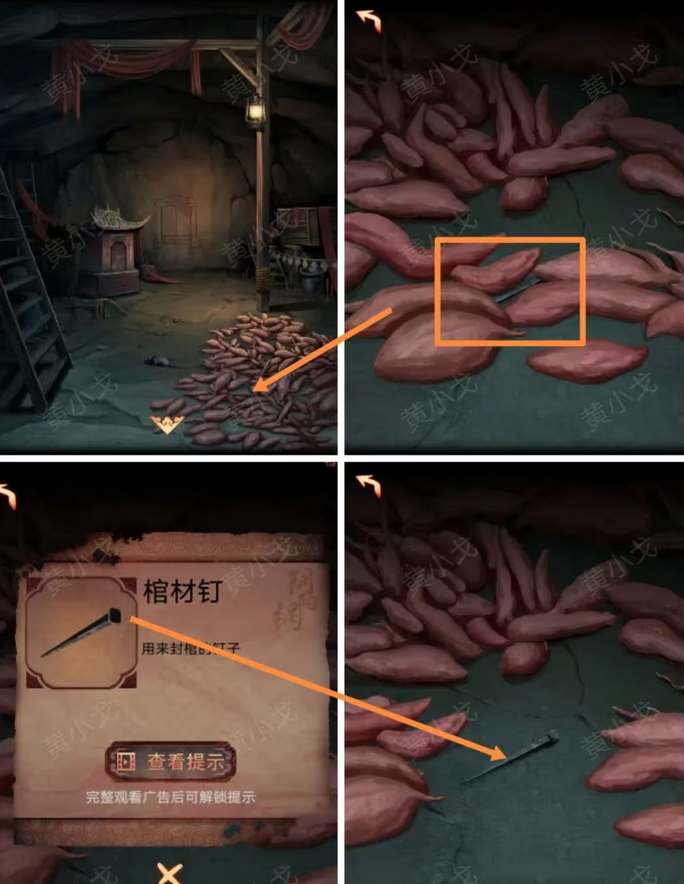 30、打开盒子获得石头像。进入地窖后调查番薯堆获得棺材钉。