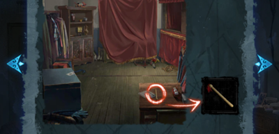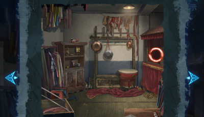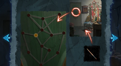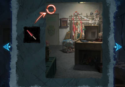 17、使用沾有红色油彩的化妆笔,在门上的脸谱上完成一笔画,打开通向仓库的门。