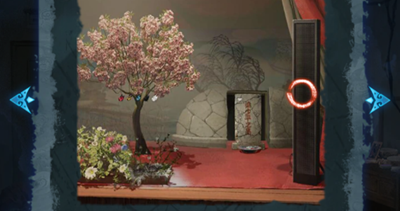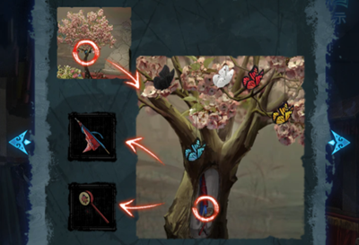 26、回到戏台上,根据木偶戏台的线索如图调整树上蝴蝶的位置与高度,拾取拨浪鼓和靠旗。