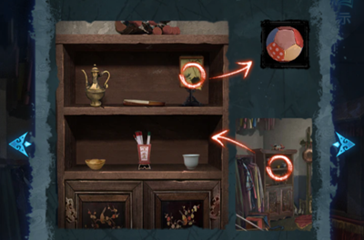 24、根据神龛上的线索,如图摆放仓库陈列架上的戏曲道具,获得玩具球。