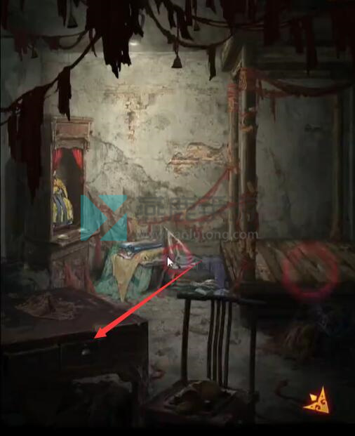 18、返回此房间点击墙上的东西,将中间的移动至如图即可出现密室,进去在床上可以获得【红盖头】。
