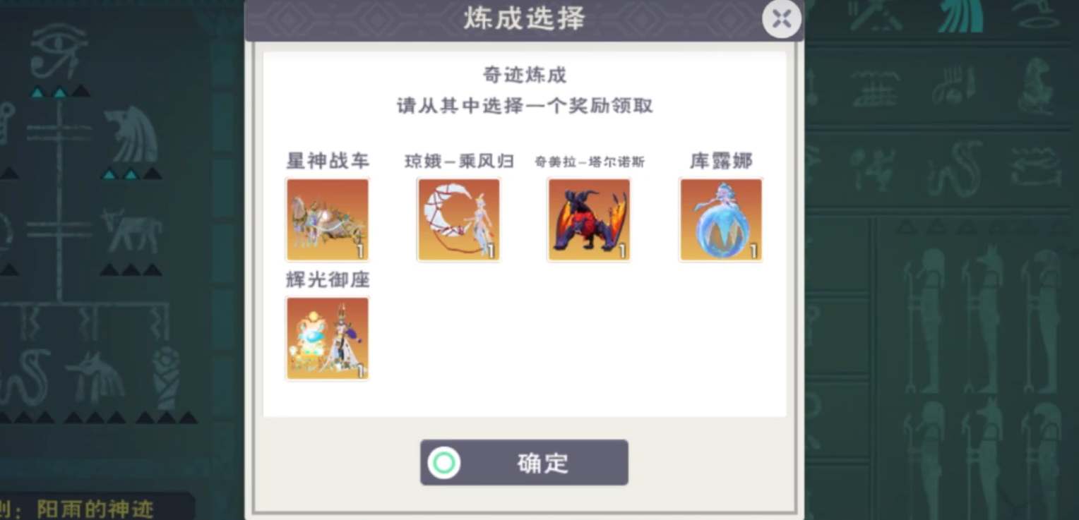 选择“等待炼成”会随机匹配一个“律”组成六个图案,就可以选择一个奖励并结束炼金。