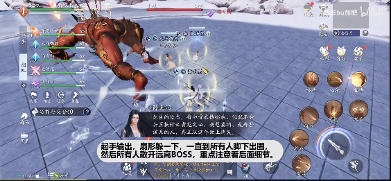 1、集体点名,身上会出一个红圈,慢慢收缩回人物。分散开,不要靠近BOSS,会被击飞,人物红圈快收缩完了,放格挡技能。