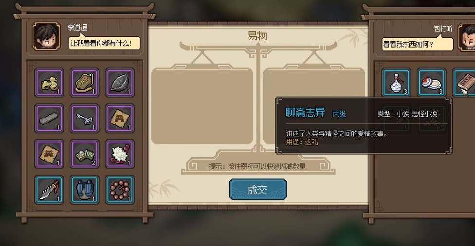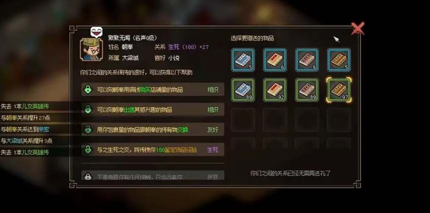 大侠立志传游戏中,玩家跟NPC赠送礼物可以提升好感度,达到一定好感度就可以邀请加入队伍,还可以触发一些特殊的隐藏剧情对话。下面为大家整理了游戏中各种礼物的获取方式以及送礼攻略,根据角色的喜好来进行送礼的话可以获得额外的加成哦。