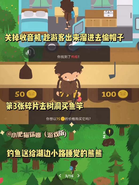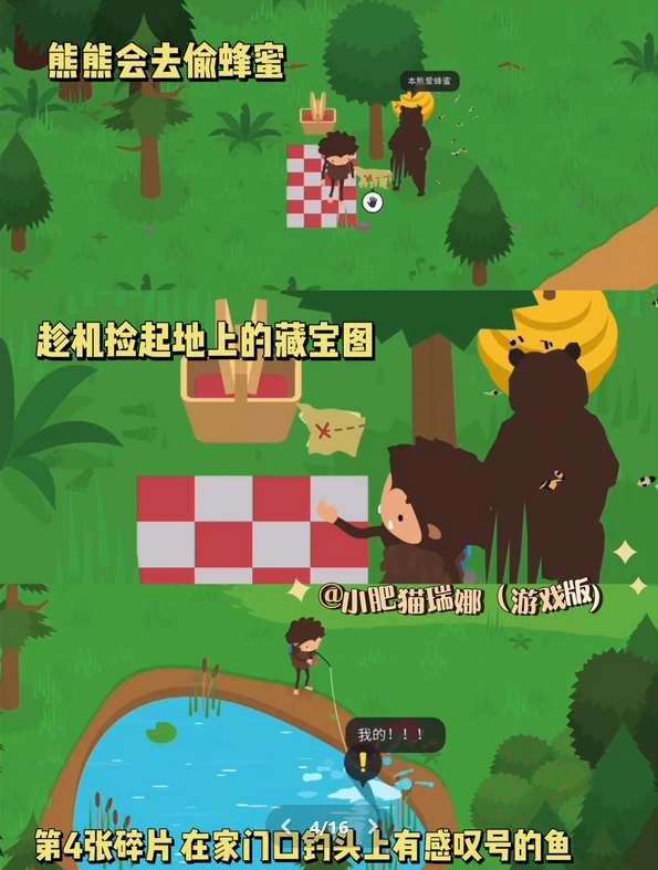 2、碎片2:湖边钓鱼给右上角的贪睡熊,它会驱赶蜜蜂,然后去树下即可找到。