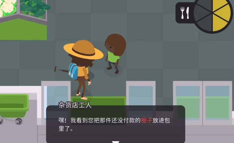 4、出门的时候收银员会出来拦截你,跟他对话完直接出门就会响起警报,此时返回超市,然后直接去左上角的厕所躲藏,等警报解除后再出门就可以了。