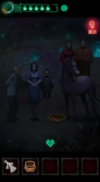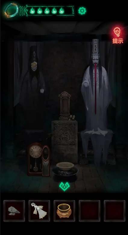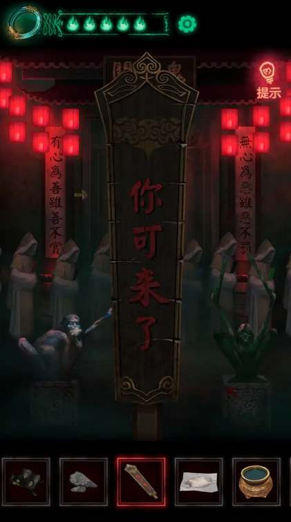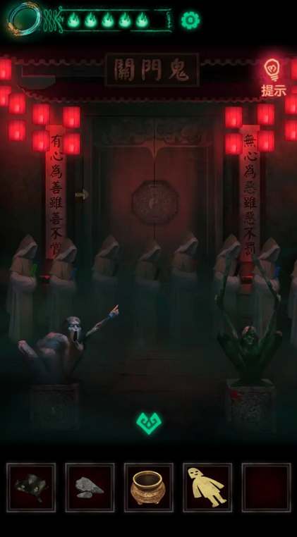 20、拿起地上小方块,右边的告示板。结合线索黑无常=水,白无常极=火,阎王=木,牛头=土,马面=金把木块调整好,开启皮影戏场景,左边书上写着“兮”=6。