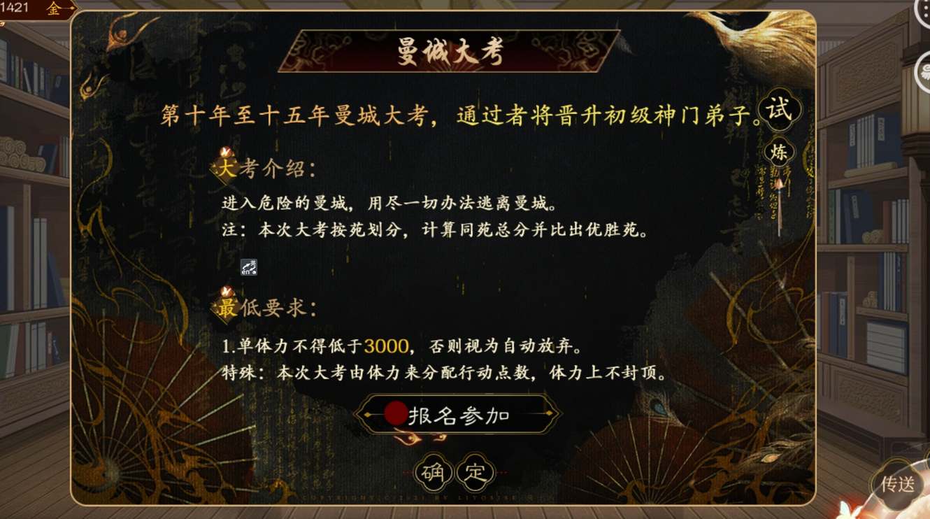 易次元神也梦千秋曼城大考是在游戏10-15年期间开放报名的,这个考试对于玩家的属性要求比较高,而且必须要做完了主线一卷的上下篇之后才能进行报名。下面为大家详细介绍一下考试的内容以及通过的属性要求。