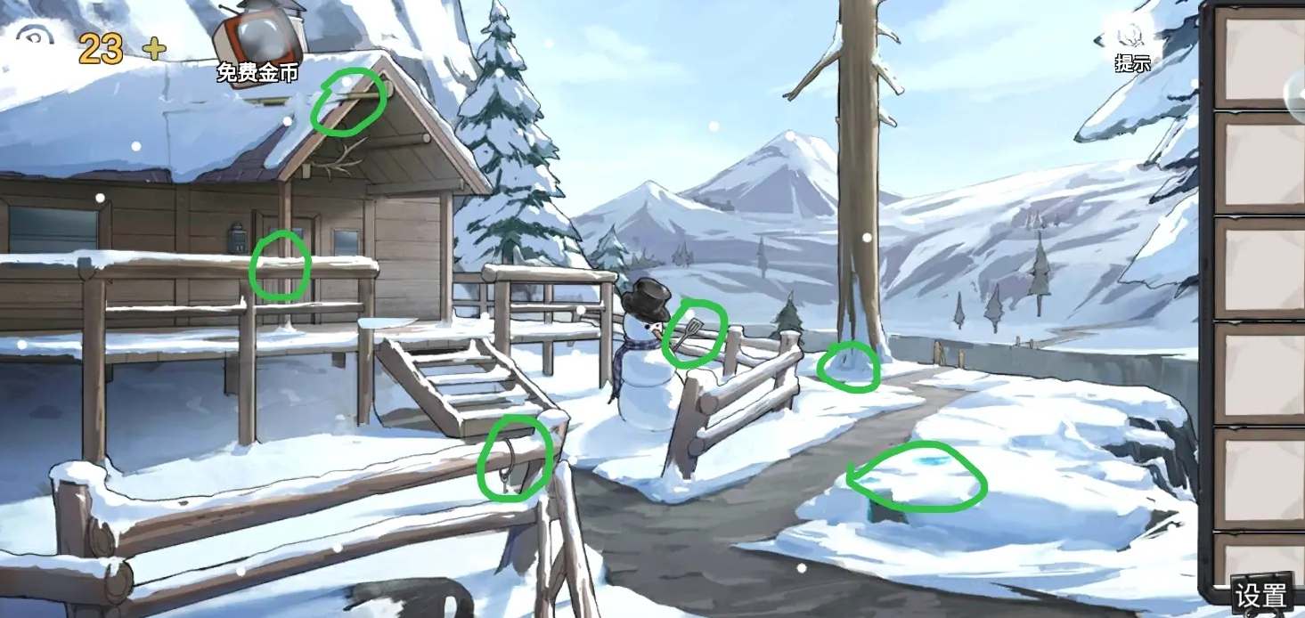 1、从雪人身上取下锅铲,铲开右边的雪堆,背包里有煤油,在箱子上拾取镜子碎片。