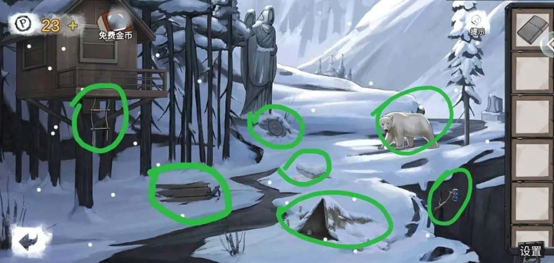 24、树干中间有半把剪刀,上面有鸟巢。用滑块打开树屋楼梯上的机关拾取雪鞋,组合剪刀剪开袋子得到浮雕。