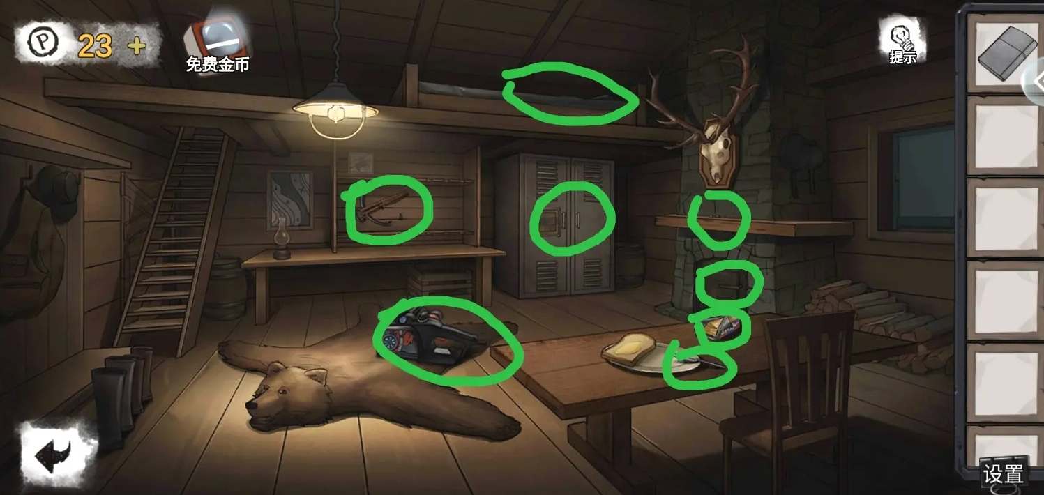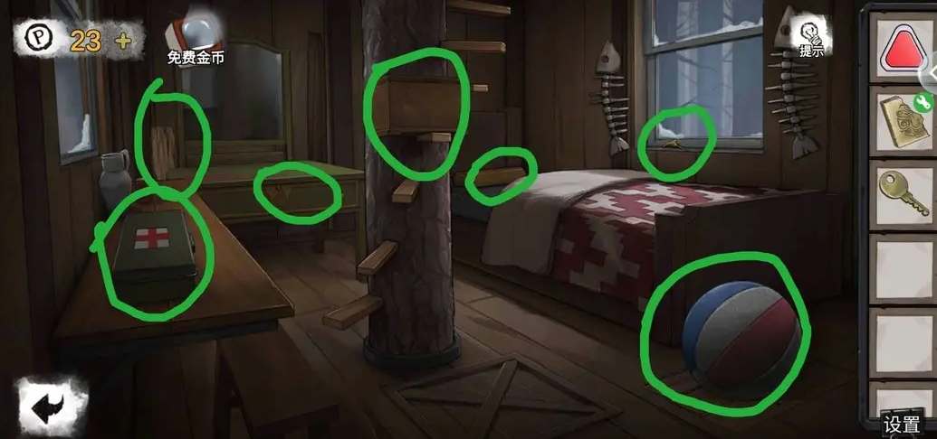 17、窗台上有开瓶器,鱼骨的数量是打开小木屋密码盒的提示。
