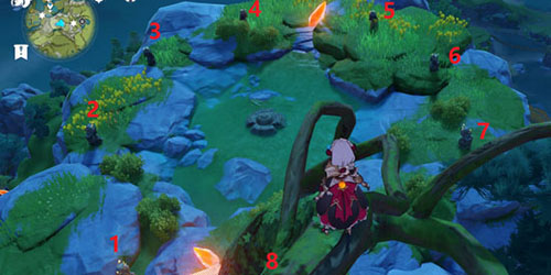 点亮顺序:7(朝着风龙废墟)-1(朝着雪山)-4(朝着庆云顶)-2(朝着璃月港)。