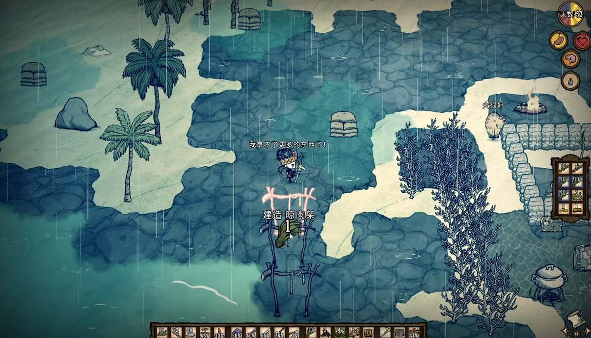2、水坑附近的食物腐烂速度增加,被积水淹没的机器建筑不能工作,如果淹没火坑的话火会熄灭,且角色行走在积水坑上会被延缓移速提升湿度。