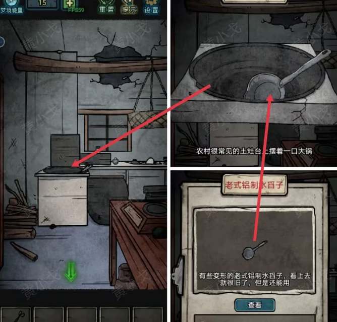 1、厨房左拾取灶台旁边的长钳子,在锅里获得老式铝制水舀子