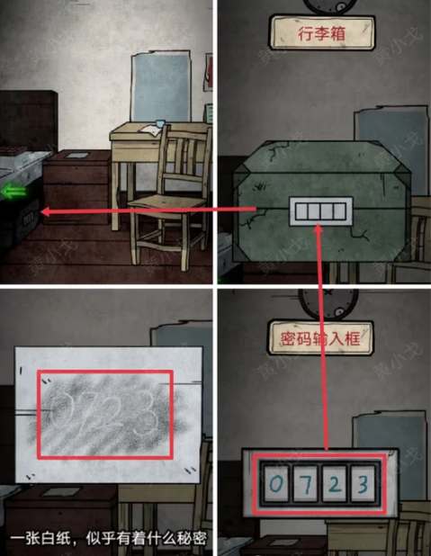 8、用钥匙开门进入卧室,右侧桌子上获得钱币,柜子点击白纸用铅笔描痕获得线索0723。